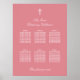 Pink 6 Table Christening Seating Chart Poster, a pretty seating chart poster featuring a white cross and elegant white text on a lovely blush pink background. Please personalize the name of the person being christened and the names of the guests along with any of the other text that you may wish to personalize, using the online personalization template before ordering.