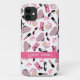 An iPhone 5 case featuring illustrations of purses, perfume, lipstick, pink diamonds, and cat eye sunglasses with a pink color scheme. Personalize with your name.