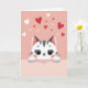 This Valentine’s Day greeting card features a sweet white cat peeking up from the bottom edge, with just its head and small paws showing, as if it’s shyly saying hello. Soft gray stripes appear on its forehead and inside its ears, with gentle pink ear centers adding warmth. The cat’s big black eyes have bright highlights and long lashes, and a light blush on its cheeks gives it a friendly, caring expression. Above the cat, red and white hearts float down in different sizes, filling the space with affection ❤️💌.