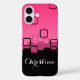 This abstract personalized phone case features some black rounded squares drifting on a pink gradient background. What's going on? I don't know; it's just bold, colorful art! You can add your own name, which appears in white with a fancy script.