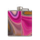 A flask with a groovy looking abstract design. Pink and black colors mix and mingle together in a swirling motion. Sprinkles of faux gold glitter in between the layers. A white rectangle frame with a faux gold foil border, layered over top with your personalized text inside.