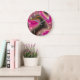 A clock with a groovy looking abstract design. Pink and black colors mix and mingle together in a swirling motion. Sprinkles of faux gold glitter in between the layers.