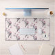 Desk mat with a watercolor painting. 2 pink and black birds sitting on a tree branch with pink blossoms.
