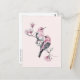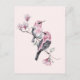 A postcard with a watercolor painting. 2 pink and black birds sitting on a tree branch with pink blossoms.