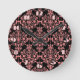 Pretty pink and black damask pattern wall clock. Hang it in the library, den, beach house, or office. This clock would make a unique housewarming or boatwarming (or houseboat warming) gift. Available in two sizes of round clock, or a square clock. Copyright Scarebaby Design.