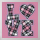 Stacked LOVE letters in grey, black and dusty pink plaid with a pink heart in place of the letter O and a soft lavender outline.