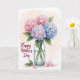 This design shows a bouquet of rounded flower clusters painted in a light, watery style, like a gentle wash of color. Three large blooms sit near the top—one soft blush pink, one pale lavender-blue, and one bright sky blue—each made of many small overlapping petals that feel like they’re leaning close in quiet affection ❤️. Fresh green leaves peek between the blossoms, adding a calm contrast that makes the colors feel even more tender. The flowers rest in a simple clear glass jar, where the stems are visible through the water and the glass catches soft highlights. Behind it all is a pale cream-and-peach background that looks softly brushed, giving the scene a warm, friendly glow 🌼. A flowing dark red message is placed in the lower left, standing out against the light backdrop without overpowering the bouquet. Near the base, two green leaves and a single fallen pink petal sit beside the jar, with the jar’s rim and waterline lightly outlined in translucent gray.