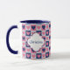 This mug was designed to be a pretty Valentine's Day gift, but it can easily be adapted to make a birthday or special occasion gift for her. It features a pretty pink, navy blue and white square hearts pattern as the background. Each side of the mug has an ornate white banner which is lined in matching blue and pink, and carries your custom text. Easily change it to her name on one side, your message on the other, or anything else you'd like. Very attractive without being glitzy or corny!
