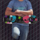 pink and blue skull skateboard deck