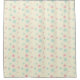 A shower curtain with a cold and wintery christmas pattern. A repeating pattern of pink and blue snowflakes set on a cream colored background. A seasonal winter time holiday design.