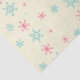Tissue paper with a cold and wintery christmas pattern. A repeating pattern of pink and blue snowflakes set on a cream colored background. A seasonal winter time holiday design.