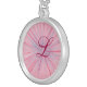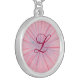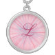 The initial is in red on a red, pink, and blue background of a circular pattern design, in a silver necklace. Easily customize the letter on the template form.