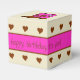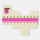 Customize this cute little favor box with the girl's name in the "happy birthday" saying. Cowgirl boots art is pink and brown and custom text is in rope font style. A pattern of little hearts all around.