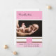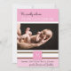 This precious baby announcement design is a wonderful way to celebrate your new arrival. This design has a light pink background blocked with white and brown stripes. In the center is a place for your personalized photo of your daughter. At the top it says We proudly welcome and your baby's name. Below the photo there is a place for her first initial monogram. To the bottom, there is a place for your baby's birth statistics, and the parent's names.