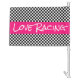 Car flag, show your sport with this designer racing themed flag in a black and white checkered design with bright pink. The white and or pink can be personalized to any color. The text can be changed to any message, or text is removable.