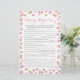 Our pink and gold glitter polka dot baby shower nursery rhyme quiz game has 15 nursery rhyme phrases with words missing. Have guests complete the rhymes and whoever gets the most correct wins. ANSWER KEY: 1)Flute 2)Basket 3)Wool 4)Pig 5)Muffin Man 6)Clock 7)Sons 8)Pail of water 9)Fat 10)Sheep 11)Field mice 12)Curds and Whey 13)Garden 14)Men 15)Farmer’s wife