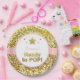 Pink and gold baby shower plates have a glittery gold background with gold and pink stars on the top. They say "Ready to POP"