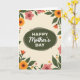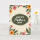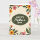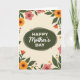 On the front of the card a dark olive-green oval sits at the center like a cozy little window, surrounded by a garden border that feels like a gentle hug ❤️. The background is a soft creamy tone, letting the flowers and leaves stand out without feeling loud. Inside the oval, the words “Happy Mother’s Day” appear in crisp white, with “Happy” and “Day” in a simple, easy-to-read style while “Mother’s” is written in a flowing, graceful look. The text is centered and evenly spaced, giving the message a calm, cared-for feel. Around it, large blossoms in golden orange and coral pink lean toward one another as if sharing a quiet moment, while deep green leaves curl and overlap like they’re sheltering the message. Smaller blooms and rounded green dots fill the gaps, adding a light, friendly rhythm 🌼. Gentle shading in the oval and soft color transitions on the petals give the artwork a tender, brushed appearance, and the floral frame includes layered leaves with darker veins and warm-toned petals tipped in pale highlights.
