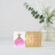Glamorous dress seamstress business card, with graphics of a pink and gold glitter dress, against a white and gold tone background, with gold glitter looking accents. Personalize the text to suit your business needs. A lovely stand out card for your tailoring business.