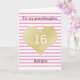 Pink and Gold happy 16th Birthday Granddaughter or any age birthday girl card. You can easily personalize the age and name. The inside granddaughter birthday message can also be personalized if wanted. The back of this gold heart birthday card also features the gold heart and pink stripes with a happy birthday message.