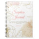 A pretty scripture journal featuring a surround of gold line drawn flowers with pink and gold watercolor washes, on a white background. The title 'Scripture Journal' is in pink script font, and the Bible verse - "The grass withers, the flower fades, But the word of our God stands forever." ISAIAH 40:8, and name personalization, in gold sans serif font. All text can be amended. This journal makes a perfect gift for your sister, mother, friend, pastor's wife, etc