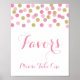 Use our pink and gold glitter polka dot baby shower favors sign to decorate your favor table and let your guests know to be sure to take a favor. Be sure to check out our large selection of coordinating baby shower items in our glitter polka dot collection!