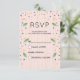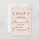 A simple RSVP card with pink and gold stripes in the background. Pink blue and orange confetti (just an image not real) sprinkled around with little green leaves along the side.