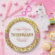 Pink and gold threenager birthday plates are for third birthdays of kids that are turning 3 but seem like a teenager. There's a sparkly gold background with pink trim. The top says "Happy Birthday" the middle says "Threenager", there's a light pink "3" then there's room for your threenager's name at the bottom.