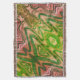 A soft throw blanket in shades of pink and green, including lime and chartreuse, in undulating waves inspired by layered stone patterns. A bright and colorful Boho chic blanket to wrap up in.