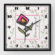 A clock with your customized name and pretty pink flower inside a square frame with a pink border. The background is a pattern with hand drawn pink wildflowers with long green stems and leaves on a eggshell white colored background. Pink circles and sprigs also decorate the design. Whimsical and pretty floral design.