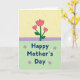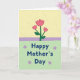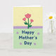 This card shows a calm, romantic garden-like scene built from simple shapes and soft, speckled color fields. Across the top, a pale yellow band reads like a quiet sky, setting a gentle tone that feels like a caring glance shared between loved ones ❤️. Rising from below is a single sturdy green stem with three bell-shaped rosy pink flowers, with deep green leaves spreading out to either side like an embrace. A thin lavender stripe runs horizontally to separate the upper area from the larger lower section, keeping the layout tidy and easy on the eyes. The bottom field is a pale green, meadow-like space with the same light speckling, where the message “Happy Mother’s Day” sits centered and large. The lettering is dark blue, rounded, and easy to read, with the words stacked neatly so they feel balanced and close together. Four tiny star-like blossoms in muted purple sit around the text as small accents, adding a friendly, celebratory touch 🌼. The background shows gentle speckles throughout, with the lavender divider cutting cleanly between the yellow top and green bottom.