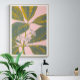 A beautiful floral illustration of a tropical banana palm frond leaf in green and yellow on a blush pink background