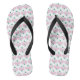 These flip flops features a pattern of pickleball paddles. Colors include pink and green.