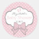 Modern chic pink and white polka dot background, with a pretty pink polka dot bow and pink baby footprints-baby shower sticker. Personalized with mom-to-be name and shower date! The small size sticker is perfect for envelope seals or attach to a metal circular tag and attach to a bag of cookies!. Larger size is great for paper plates, cups and balloons and baby shower guest favor gifts. Add matching products like invitations and baby shower guestbook. This "Pink and Grey Baby Shower Sticker" is available in other colors-Please visit my store "The Hungarican Princess" at www.zazzle.com/hungaricanprincess*. Look in my "Oh Baby" department category. Congratulations!