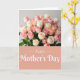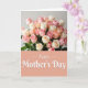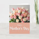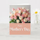 This card is divided into two balanced sections, with a lush flower arrangement on top and a wide color panel below. The upper area features a full bouquet of roses in soft blush pink, creamy ivory, and gentle apricot tones, tucked among leafy green stems that lean toward one another like close friends ❤️. Light falls in a soft, diffused way, adding mild shadows between petals so the blooms look layered and touchable. The lower portion is a large muted coral-pink rectangle that grounds the design and makes the message easy to notice. Centered on that panel, the words “Happy Mother’s Day” appear in white flowing lettering with a slight raised look. The contrast between the warm background and the bright text draws your eye downward, like a quiet pause after admiring the flowers 🌼. The final detail is the way the bouquet fills the top edge with rounded rose heads while the coral panel sits beneath it as a smooth, solid band.
