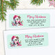 These unique pink and mint green Christmas return address labels feature the "Merry Christmas" saying in casual script font and a cute penguin in a pink Santa hat. The template makes it easy to type your address before ordering.