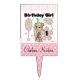 Pink and Mint Monkey 1st Birthday Cake Topper, easy to customize with her name before ordering, features a monkey with a party hat, balloons, birthday gifts, and lots of pretty flowers and polka dots.