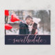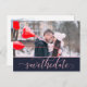 Save the Date postcards with navy band along the bottom - ornate calligraphy script spells out save the date in pink - personalize with your own information and photos. If you need help with your photos, please email me at shutterbug600@yahoo.com - I am happy to help you.