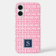Our classic pink and navy preppy style phone case is uniquely yours, with your single initial monogram tucked neatly into the design! Case features a modern greek geometric pattern in bright candy pink and white, with your monogram displayed on a navy blue square badge.