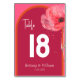 This design features bold pink and orange watercolor floral themed vibrant summer wedding table card with elegant script fonts for couple's name, and clean font for details.