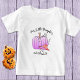Cute non-spooky Halloween baby or toddler shirt for girls. Printed with illustration of a pink pumpkin and a pink and orange polka dot witch hat with black accents. Edit text to personalize.