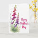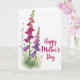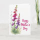 This card features a watercolor-style bouquet of elongated, bell-shaped blossoms rising along the left side, like a gentle companion leaning in close ❤️. The flowers shift from deep pink at the top into lavender and rich purple toward the base, with softly flared edges and fine white lines tucked inside each bloom. Thin stems weave through the cluster with tiny blue buds and small blush-pink blooms, adding little “hello” moments that feel like friendly nods between petals. A light green wash sits beneath and around the stems, suggesting fresh leaves without crowding the open white background. On the right side, the message “Happy Mother’s Day” appears in flowing lettering, set in a deep pink tone that echoes the strongest flower shades 🌼. The text is placed with plenty of breathing room, balancing the left-heavy florals while keeping the overall look airy and calm. Fine watercolor shading gives the blossoms a soft glow, and the white space makes the colors stand out without feeling busy. The tallest blooms reach near the upper left corner, while the smaller blue sprigs trail inward toward the center.