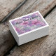 This floral editable soap box label measures 3 inches by 2 inches (76 mm by 51 mm) and is waterproof. It features a background with pink and purple flowers containing black text with space for your company name, product name, ingredients, product description, and business contact information. This label is designed as a label for soap boxes or soap bars, but it could also be used a a label for cosmetic jars or candles.