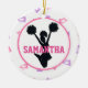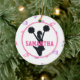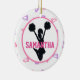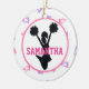Design features a white background with pink and purple megaphone pattern. In the center is a white circle with pink trim. Inside the circle is a black silhouette of a cheerleader jumping in the air with outstretched arms holding pom poms. Across the center is a place to personalize with a name in fun pink jersey style font. The reverse side of the ornament has the same pink and purple megaphone pattern. The perfect gift for cheerleaders, cheer coaches, and cheer Moms!