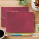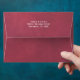 This summer wedding envelope displays a lovely design, consisting of a burgundy colored stained background on the outside and a bouquet of red and pink toned dahlia flowers and foliage on the inside.