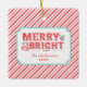 This Christmas ornament features a cheerful design with text that says "Merry & Bright." You can personalize with your name and year at the bottom. On the back is another coordinating pink and red diagonal stripe pattern.