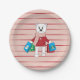 Some pink Holiday paper plates with red stripes and a polar bear carrying some shopping bags , Perfect for your Christmas party . Check for our paper napkins and paper cups in the same collection .