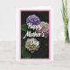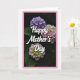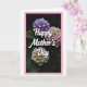 This card shows three rounded flower clusters arranged vertically against a deep green background that fades nearly to black, creating a cozy, intimate mood ❤️. The top cluster is shaded in soft lavender and violet, while the two lower clusters blend pale pink into creamy white with touches of light green near their centers, like a gentle embrace between close friends. The petals are shown in many tiny florets, giving the blooms a textured, layered look that feels tender and carefully observed. Across the middle, the words “Happy Mother’s Day” sit over the flowers in flowing white lettering, standing out clearly against the darker tones. The text runs horizontally through the central area, slightly overlapping the upper and lower blossoms so it feels nestled into the bouquet. Soft lighting grazes the petals, adding subtle highlights and making the pastel colors look calm and affectionate 🌼. A thin, bright pink border frames the entire image, enclosing the floral scene with a neat outline.