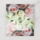 Elegant folded place card with a photograph of pink and white roses as the background. The inside of the place card is done in pale pink. A semi transparent white rectangular text area, on the front of the card is ready to personalize by hand, for your wedding reception.