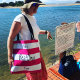 Best Day Ever tote bag in hot pink and white stripes.
